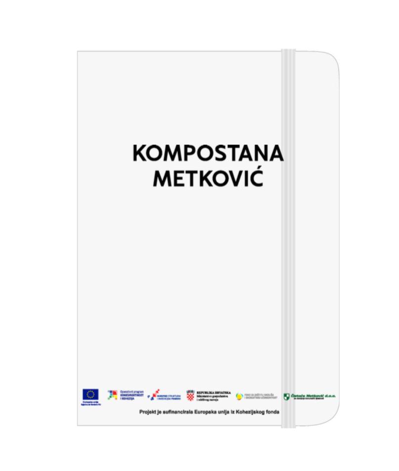 U sklopu projekta "Izgradnja kompostane Metković" izrađeni su promo materijali - Notes A5 s tiskom 50 komada, majica kratkih rukava s tiskom 100 komada, kemijska olovka s tiskom 100 komada te kapa šilt s tiskom 20 komada.